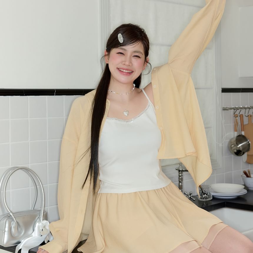 Plain Lace Trim Crop Camisole Top / Long-Sleeve Heart Embroidered Button-Up Slit Shirt / High Rise Layered Mini A-Line Skirt / Set