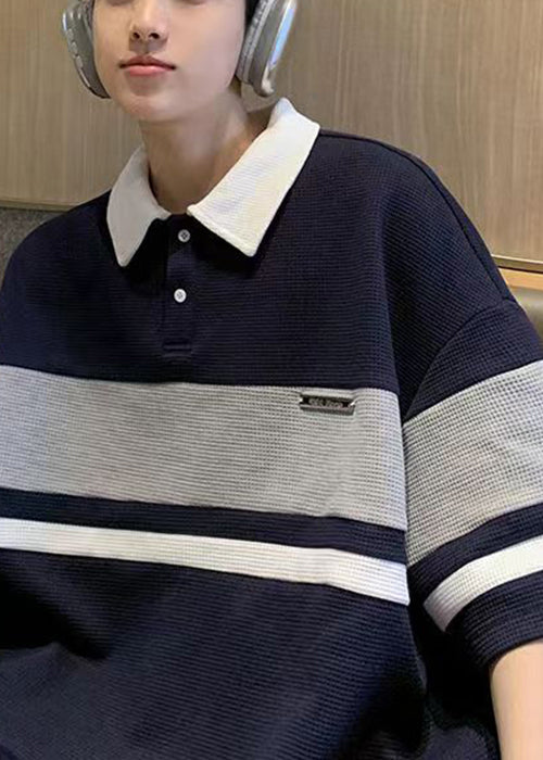 Polo Button Summer Cotton Shirts Loose Mens Grey Patchwork