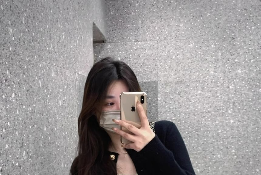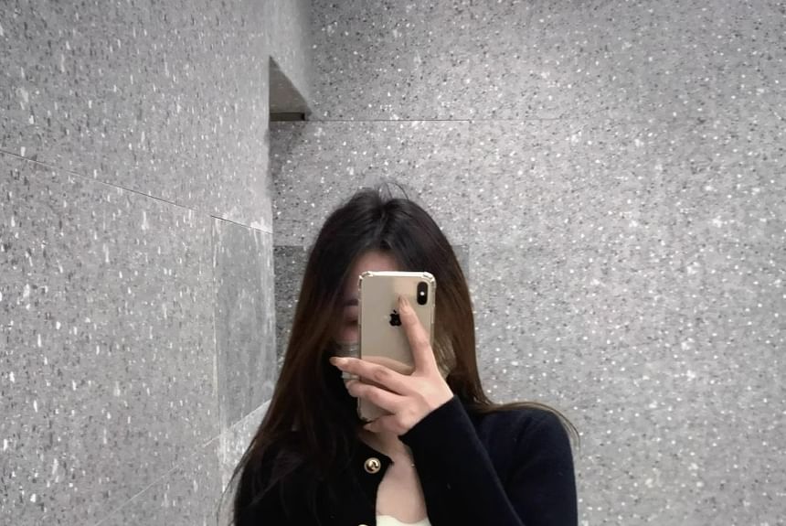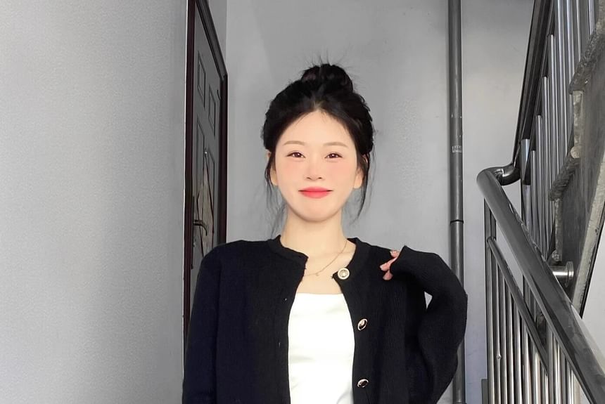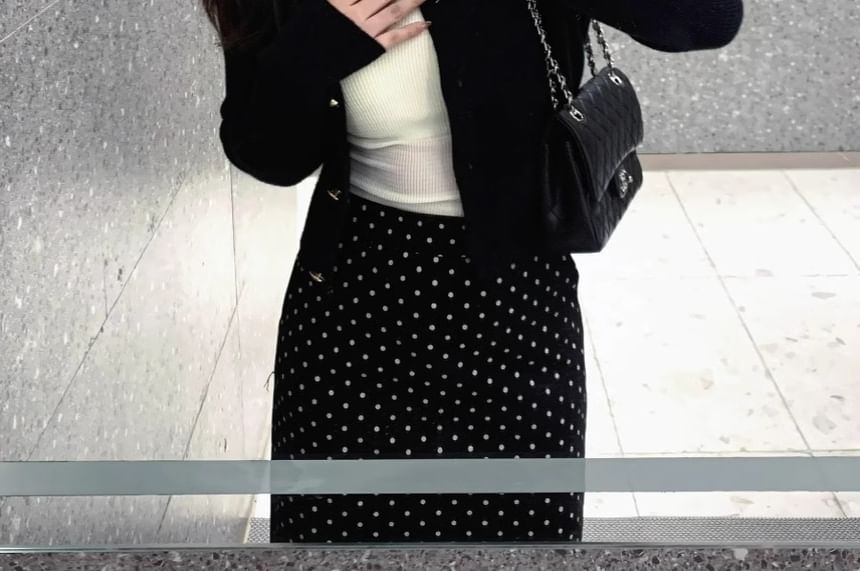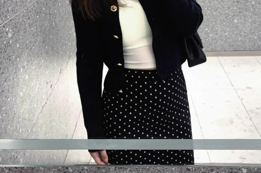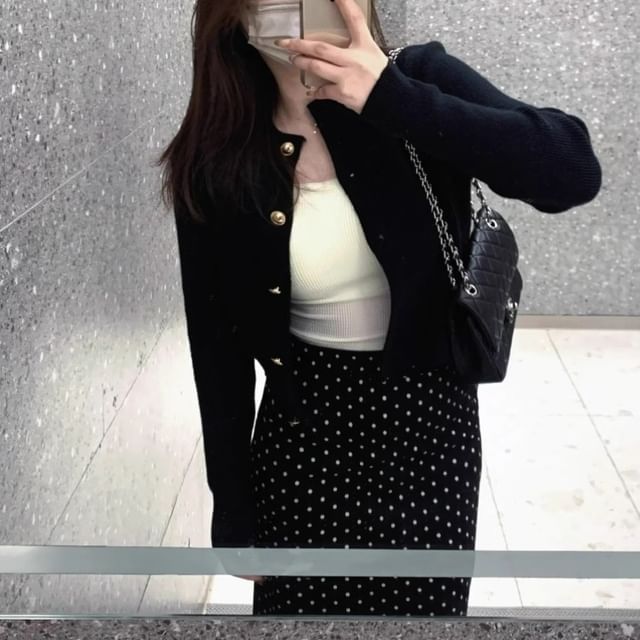 Scoop Neck Plain Crop Camisole Top / Crew Neck Button-Up Cardigan / High Rise Dotted Slit Maxi Pencil Skirt / Set