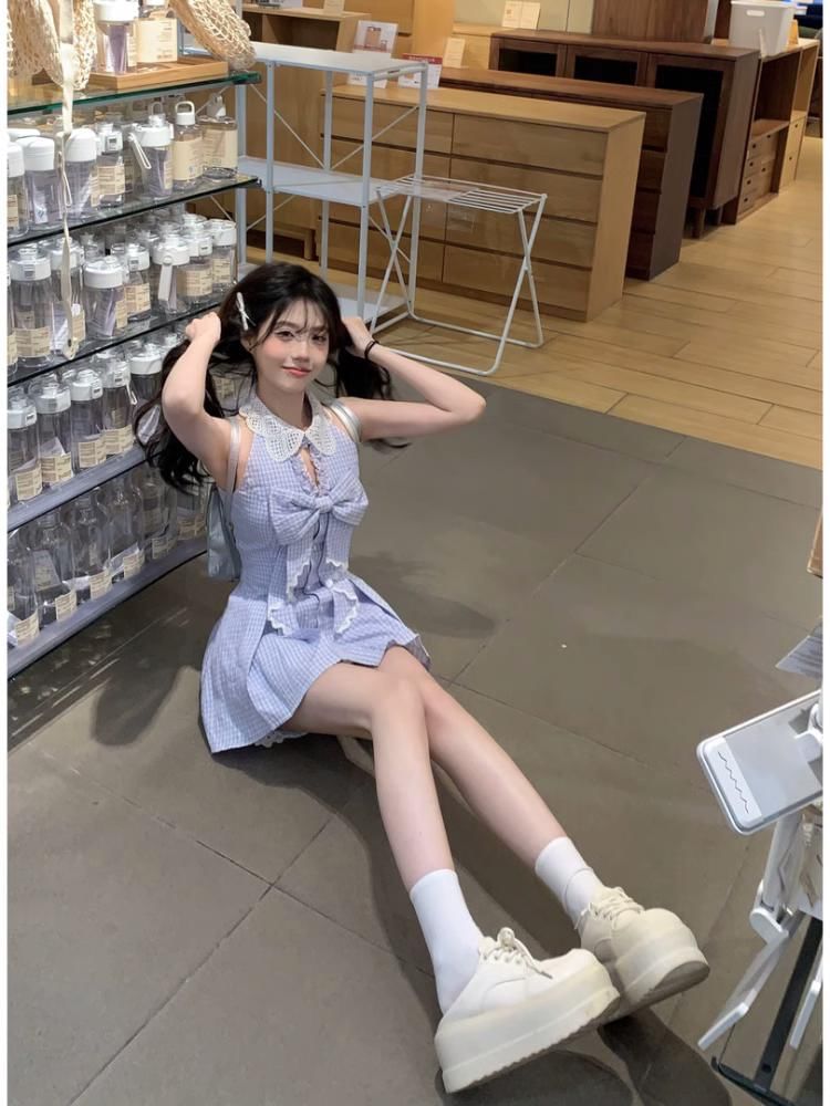 Set: Contrast Collar Plaid Bow Ruffle Pleated Mini A-Line Dress + Shorts