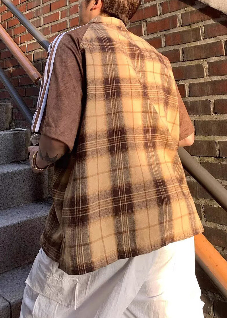 Shirt Mens Art Half Cotton Plaid Sleeve Yellow Patchwork