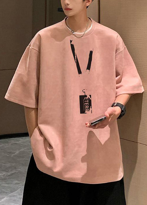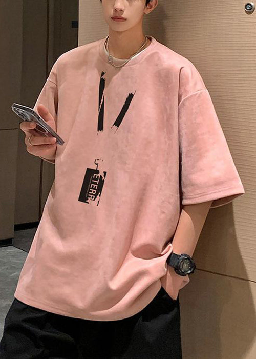 Loose Pea Green O Neck Print Faux Suede Men T Shirts Summer