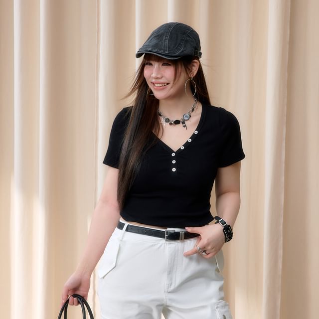 Short-Sleeve V-Neck Henley Ribbed Crop Slim Fit T-Shirt