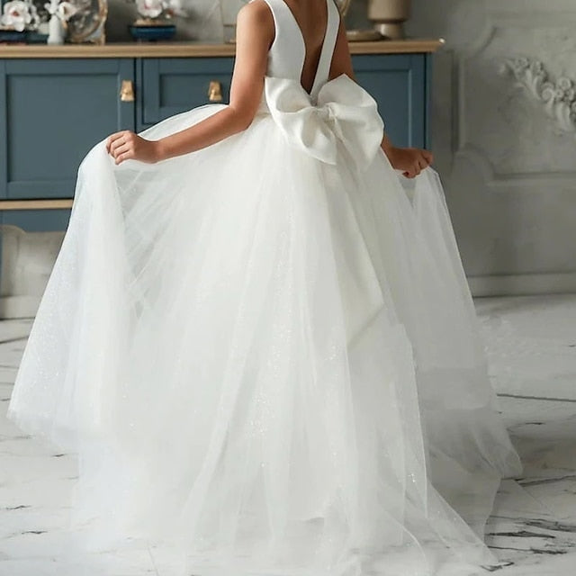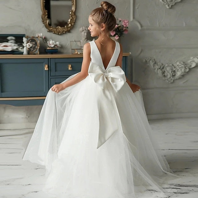 Gender: Girls', Age Group: Kids, Style: Sweet, Princess, Elegant, Occasion: Performance, Wedding, Party, Special Occasion, Pegeant, Kids Apparel: Dress, Fabric: Cotton, Tulle, Pattern: Solid Colored, Sleeve Length: Sleeveless, Design: Bow, Mesh, Backless, Age: 3-12 Years, Season: Summer, Winter, Fall, Spring, Look After Me: Hand wash, Fit Type: Regular Fit, Dresses Type: A Line Dress, Dress Length (cm): Asymmetrical,