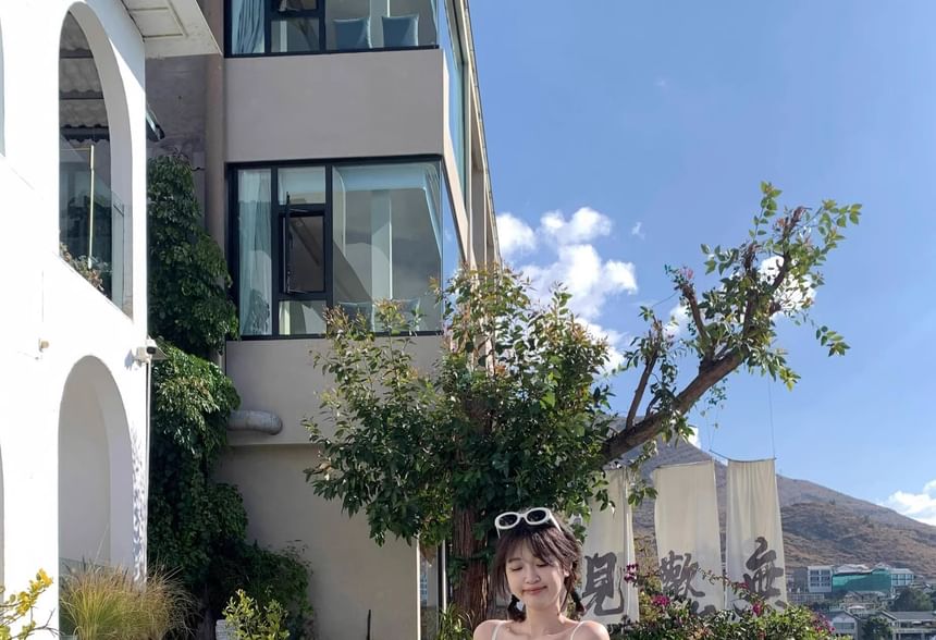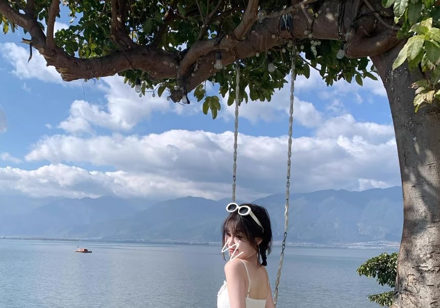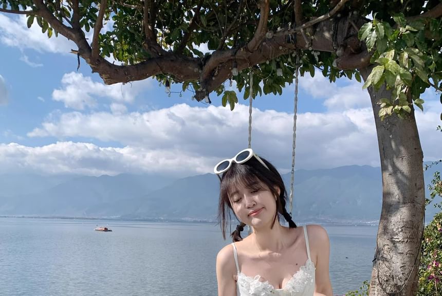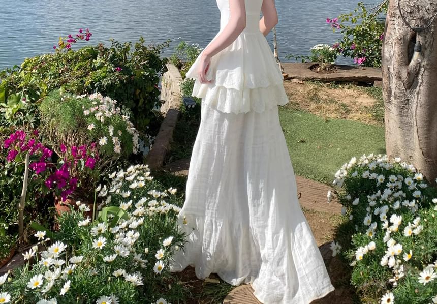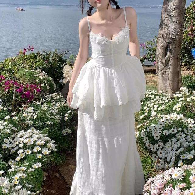 Spaghetti Strap V-Neck Plain Lace Panel Layered Mini A-Line Dress / High Waist Maxi A-Line Skirt