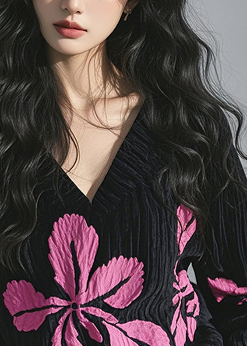 French Black V Neck Print Corduroy T Shirt Top Spring