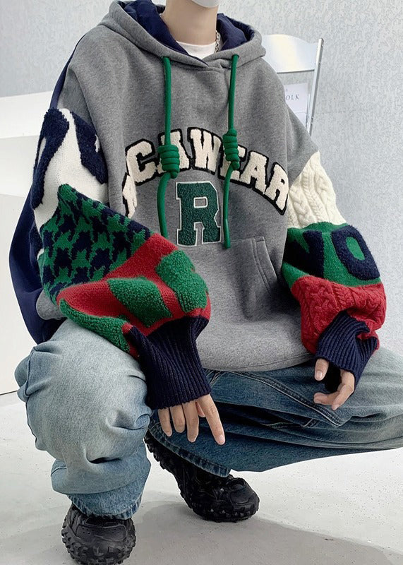 Style Grey Embroideried Patchwork Cotton Hoodie Men Fall EQ009