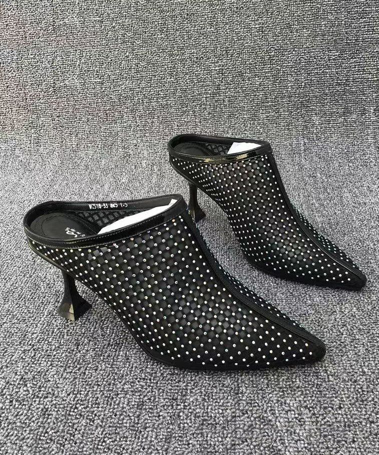 Stylish Gold Tulle Zircon High Heel Slide Sandals Pointed Toe OI026