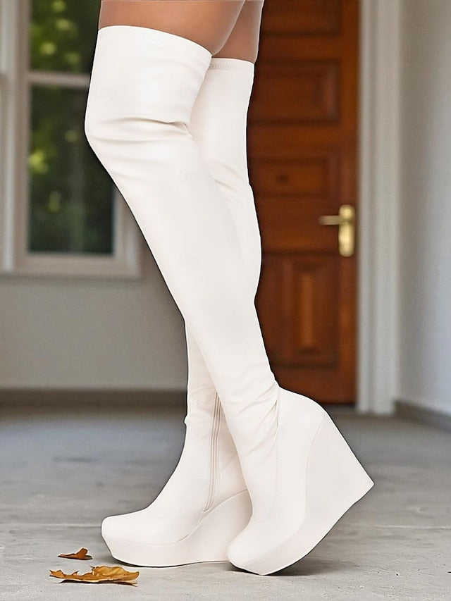 Gender: Women's, Category: Boots, Style: Fashion, Vacation, Sexy, Type: Over The Knee Boots, Occasion: Party, Wedding, Activity: Walking, Toe Shape: Round Toe, Upper Materials: PU, Lining Materials: Synthetic Leather, Outsole Materials: Rubber, Season: Winter, Fall, Summer, Spring, Size Suggestion: standard size, select your usual size, Closure Type: Zipper, Heel Height(inch): 4.72, Heel Type: Platform, Wedge,