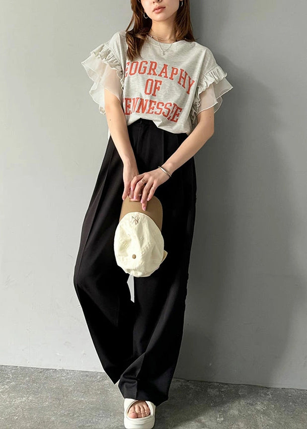 Chic Grey Ruffled Patchwork Print Cotton Tops Summer