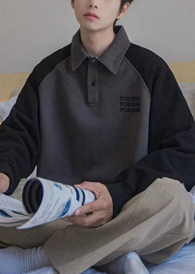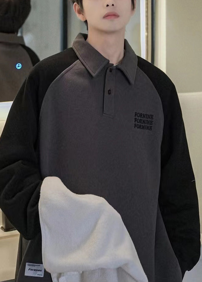 Unique Dark Grey Peter Pan Collar Patchwork Warm Fleece Men Sweatshirt Fall EQ006