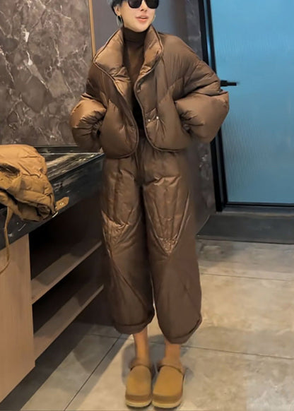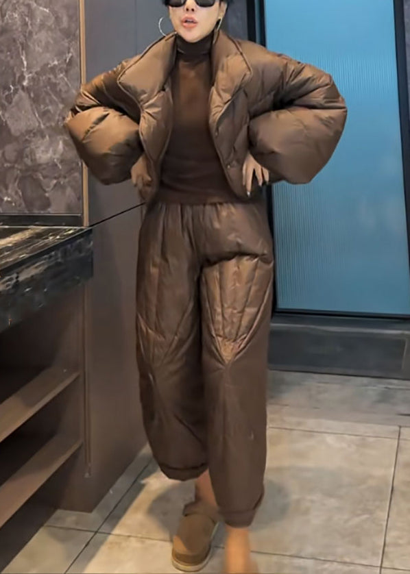Indulge in sophistication with our Women's Coffee Button Coat and Crop Pants. This two-piece set features cotton filling for a luxurious touch, perfect for the spring season. Elevate your style with this exclusive ensemble.