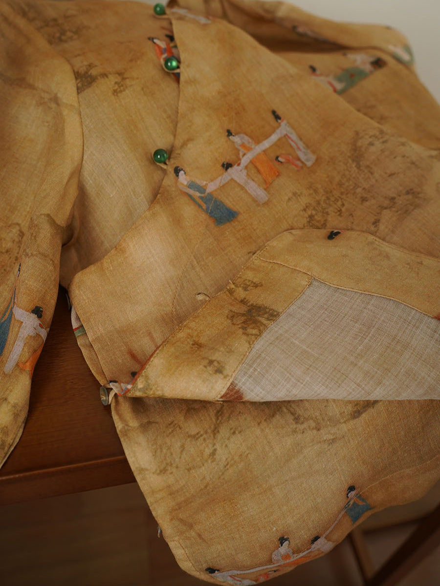Women Ethnic Print Ramie Stand Collar Loose Shirt FG1043