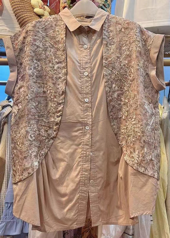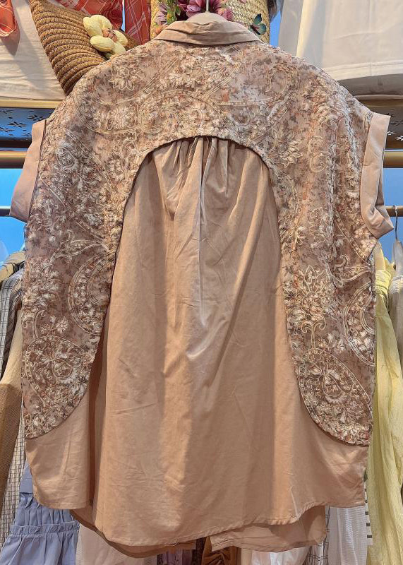 Experience the ultimate luxury with our Women's Khaki Peter Pan Collar Print Patchwork Cotton Shirt Top for a chic and sophisticated summer look.