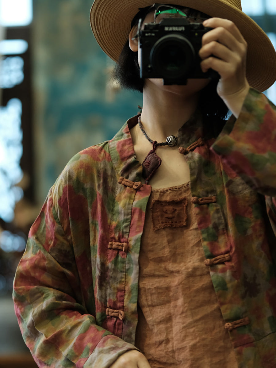 Women Summer Retro Flower Button-up Long Ramie Shirt FG1041