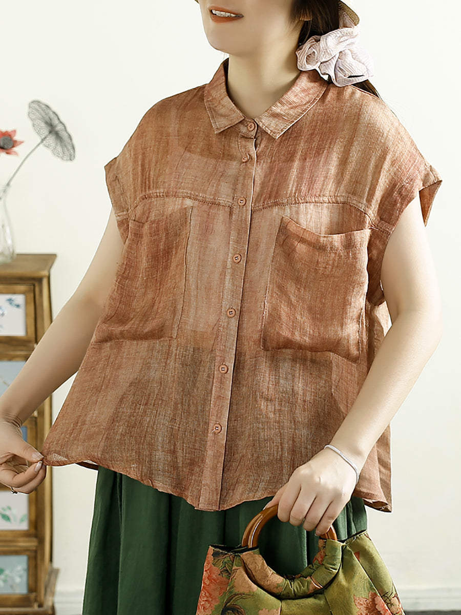 Women Summer Vintage Solid Button-up 100%Ramie Shirt CV1010